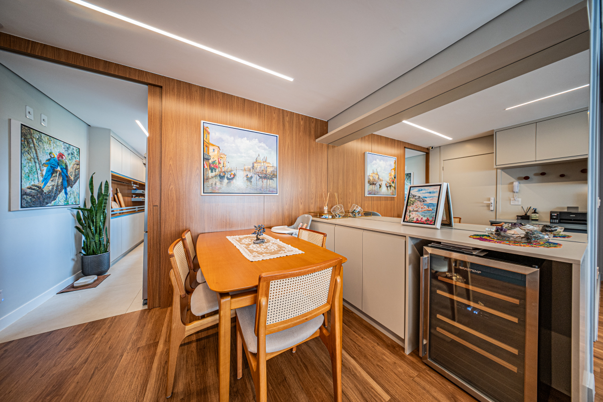 Apartamento com projeto arquitetônico personalizado, onde cada detalhe foi pensado para criar uma experiência única de morar. Um dos grandes destaques está na integração entre a sala e a varanda: o piso faz uma elegante fusão entre o revestimento frio e a madeira, criando um efeito visual que lembra as águas do mar encontrando a areia, um detalhe sofisticado que valoriza ainda mais o ambiente.