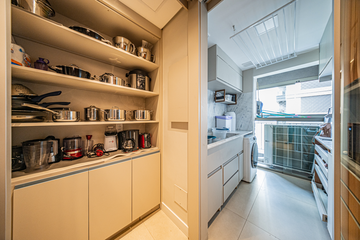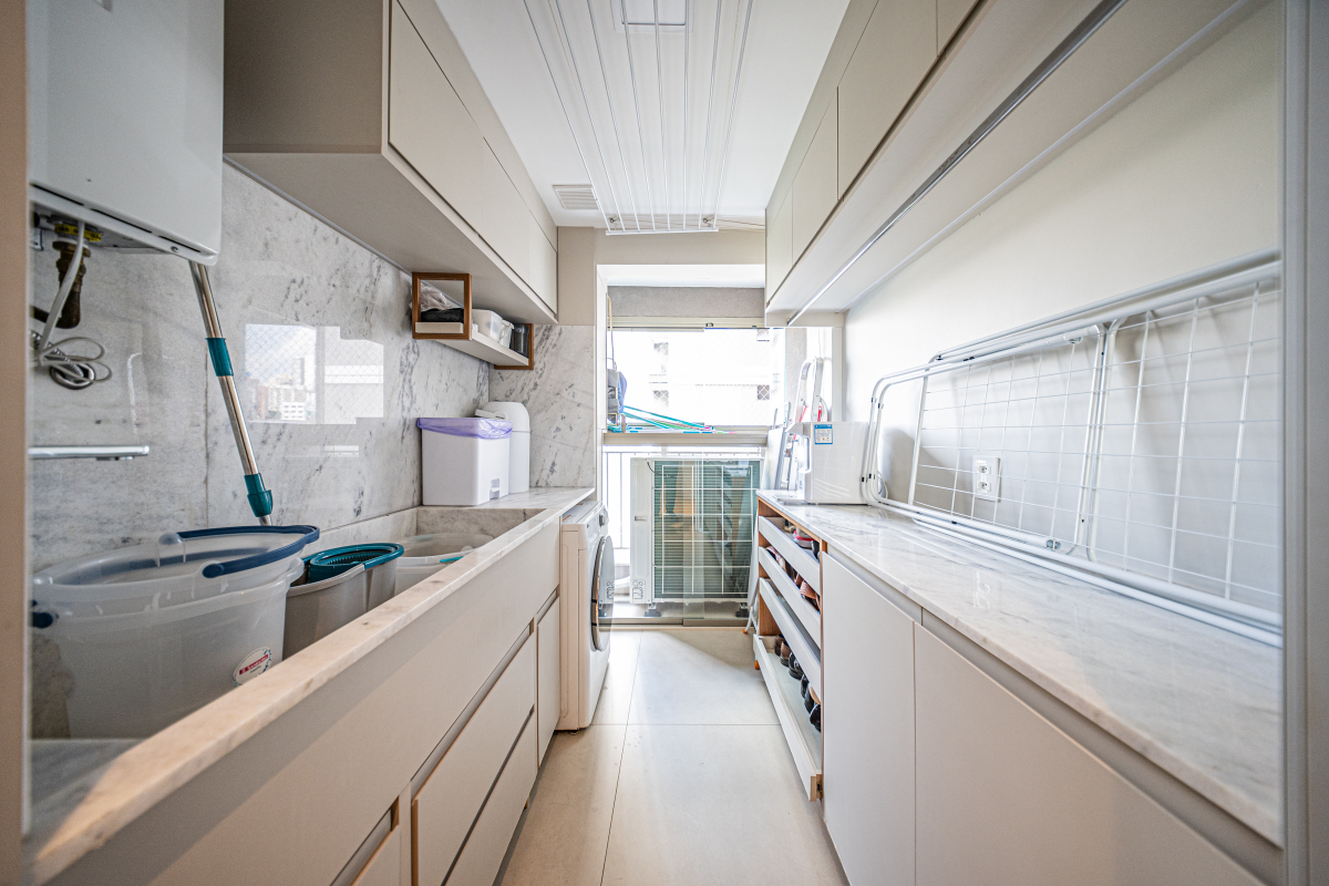 A cozinha é iluminada e funcional, com janela sobre a pia e armários planejados de muito bom gosto. A lavanderia segue o mesmo conceito de projeto, mantendo a harmonia estética e a eficiência dos espaços.