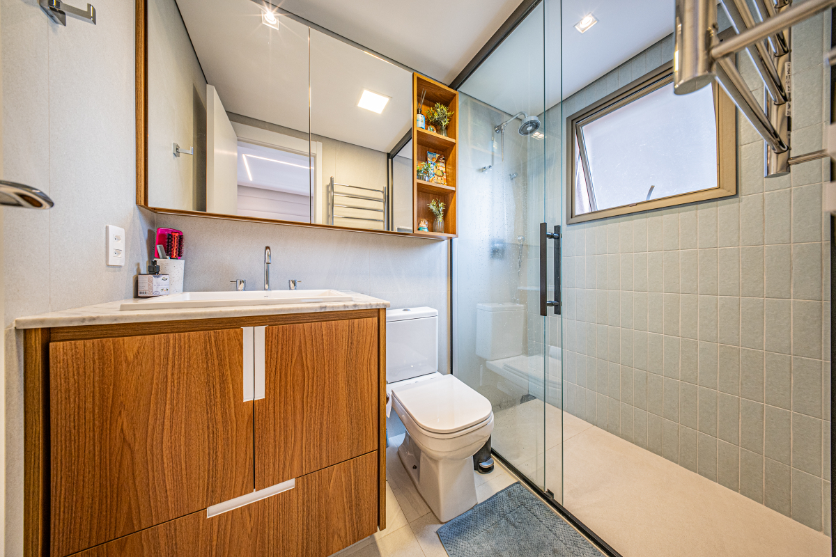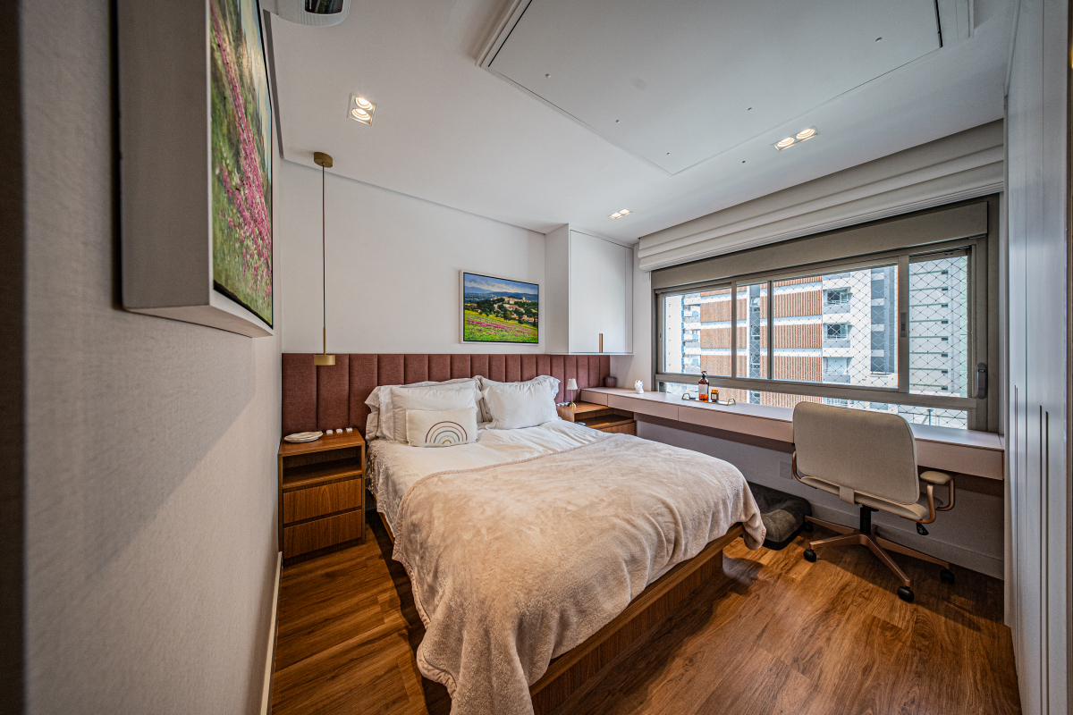 O apartamento conta com 2 suítes, sendo que uma delas foi ampliada para acomodar um armário mais espaçoso, trazendo ainda mais praticidade.